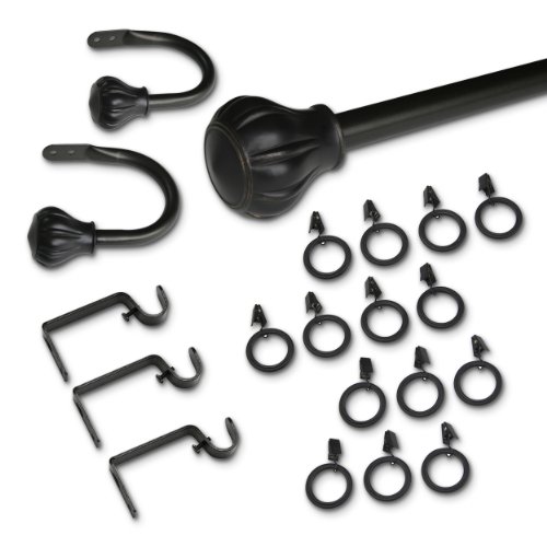 • Set includes one 48-inch to 84-inch telescopic rod, two finials, three steel support brackets, screws, the dry wall inserts to mount the brackets, two holdbacks, and 14 matching rings